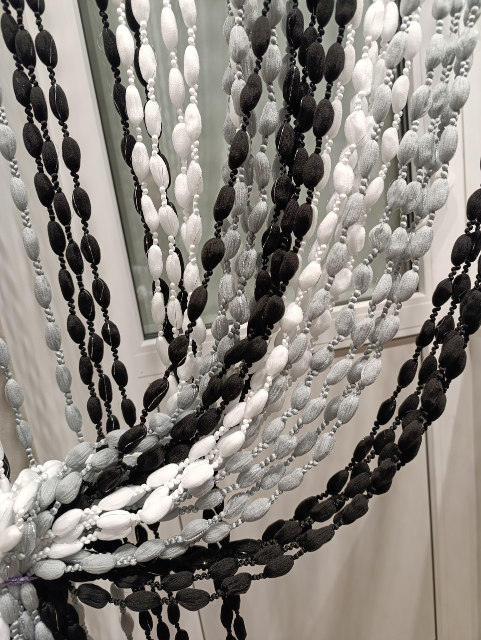 Структурні штори-нитки у формі нанизаних мигдалин для зонування приміщення й вікон однотонні із додаванням люрексу.